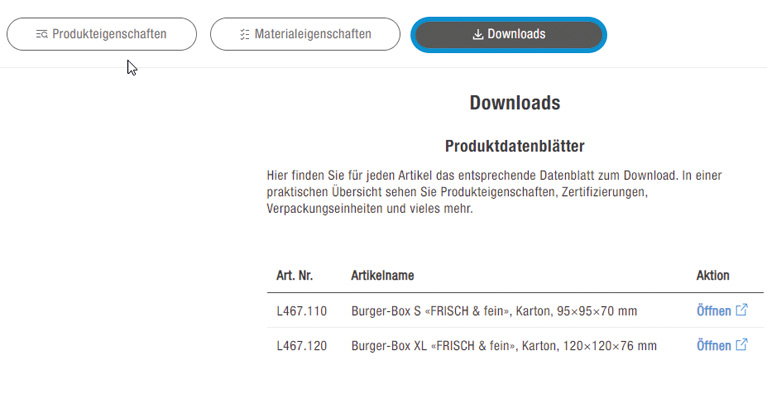 Auf den Button «Downloads» klicken. Unter den «Produktdatenblättern» liegen die gewünschten Konformitätserklärungen Ihrer gewählten Lebensmittelverpackung.