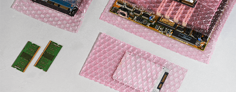Eine sehr gute Lösung, um Elektronik sowohl vor elektrostatischer Aufladung als auch vor mechanisch verursachten Schäden zu schützen, ist etwa unsere Luftpolsterfolie ANTISTATIC rosa.