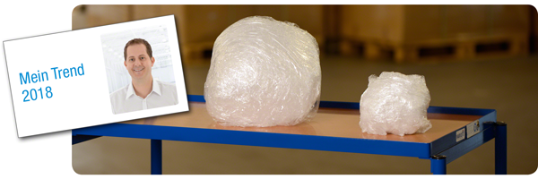 Eine Frage, die sich Unternehmen 2018 verstärkt stellen werden, ist aus meiner Sicht: Wie viel Verpackungsmaterial benötige ich wirklich, um meine Produkte sicher zu verpacken? Wer das verwendete Material analysiert und in der Menge optimiert, profitiert in vielerlei Hinsicht. Zum einen agiert er nachhaltig: Je weniger Ressourcen wir verbrauchen, umso besser für die Umwelt. Darüber hinaus sparen sich Unternehmen Geld, wenn sie eine geringere Menge an Verpackungsmaterial einkaufen, und gewinnen Platz, da weniger Lagerfläche benötigt wird.