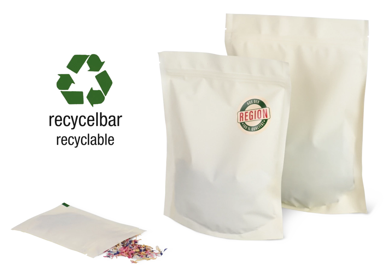 Verpackungen, die aus nur einem Material bestehen, bezeichnet man als Monomaterial-Verpackung. Eine praktische sowie umweltfreundliche Lösung für Lebensmittel stellt unser MECASEAL Standbodenbeutel Aromaschutz recycelbar aus 100 % PE-Monomaterial dar. Er ermöglicht die sichere Aufbewahrung von Nüssen, Trockenfrüchten, Kräutern, Nahrungsergänzungsmitteln und anderen aromatisierten Produkten. Dank der Kombination aus PE-Monomaterial und leistungsfähiger Barriereschicht wird das Eindringen von Feuchtigkeit oder Sauerstoff verhindert. Ihre Produkte bleiben länger frisch und das Aroma wird beibehalten. Außerdem sind die Beutel widerstandsfähig gegenüber Rissen und Beschädigungen.