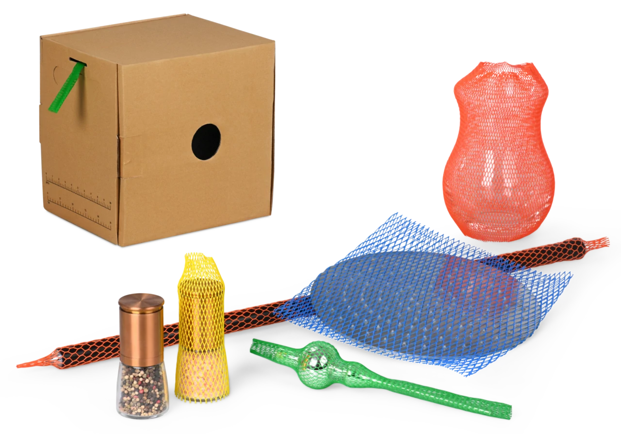 Kanten und empfindliche Oberflächen schützt auch der Netzschlauch PROTEC RECYCLING vor Kratzern. Gegenstände, deren Material aus Glas oder Keramik besteht, werden vom Netzschlauch sowohl bei der Lagerung als auch beim Transport bestens geschützt, denn dank seiner Elastizität passt sich der Netzschlauch optimal dem Gegenstand an und umschließt ihn rund herum. Aufgrund seiner Flexibilität lässt er sich zeitsparend anwenden, indem der Schlauch einfach um das zu schützende Produkt gezogen wird. Zu 100% aus recycelten Kunststoff gefertigt, ist er beständig gegen Wasser, Öl, Fett und gängige Lebensmittel und die geeignete Wahl, um ressourcenschonend Artikel in allen Formen zu schützen.