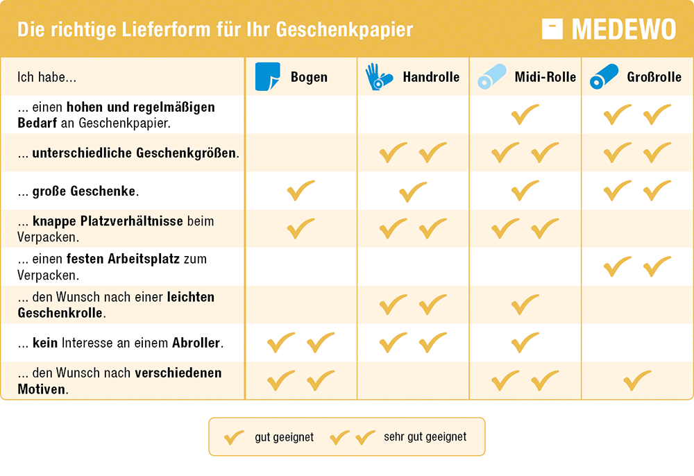 Alle Fragen beantwortet? Dann hilft Ihnen diese Tabelle die richtige Lieferform für Ihr Geschenkpapier zu finden.