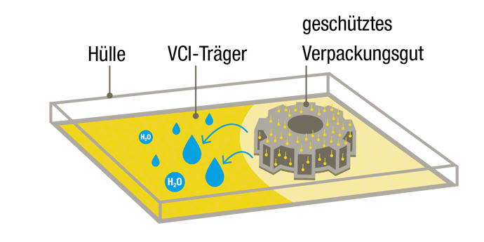 Bei der VCI-Methode ist der Wirkstoff bereits in die Verpackung (LDPE Folie oder Papier) eingearbeitet. VCI-Moleküle dampfen kontinuierlich auf diese Weise in der Verpackung aus und legen sich wie eine Schutzschicht an die Oberfläche, was die Reaktion mit Feuchtigkeit und Sauerstoff verhindert.