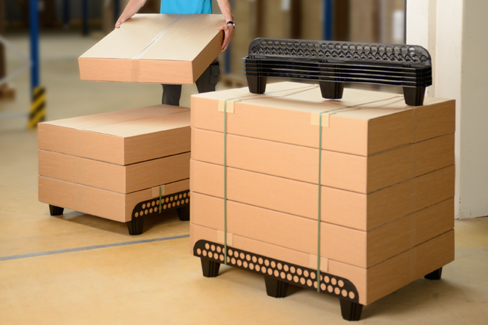 Der Palettenrahmen aus Wellpappe kann individuell an die Füllhöhe angepasst werden, ist sehr robust und schützt damit die Ware effizient und platzsparend.
