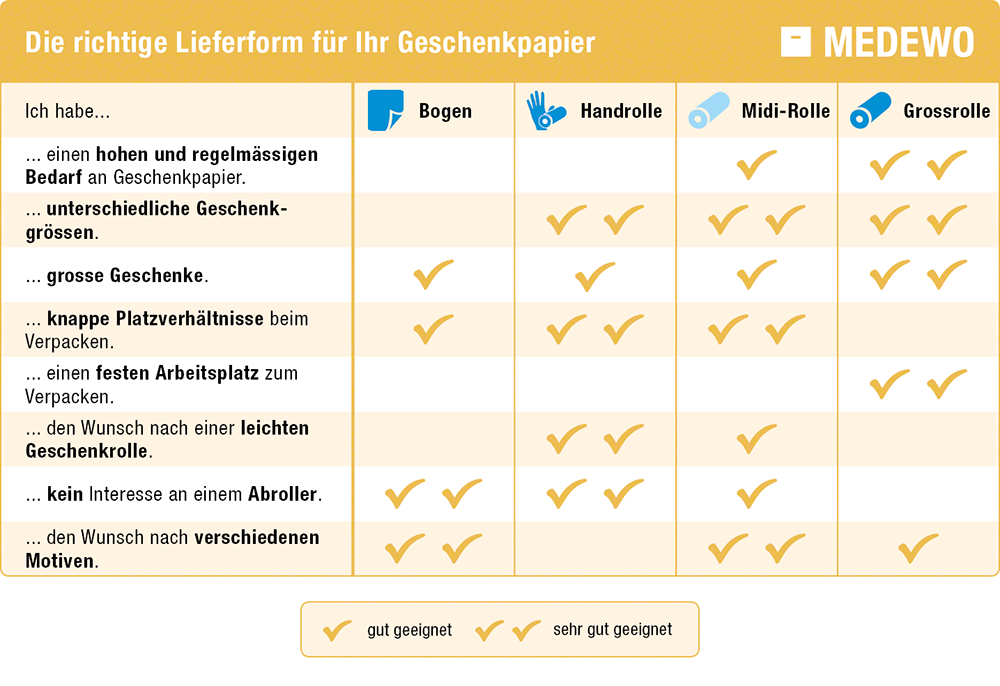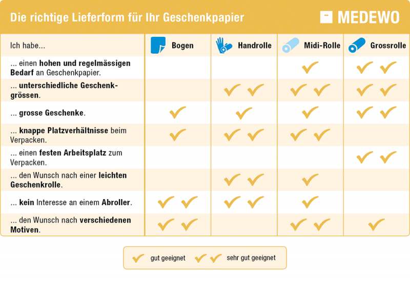 Alle Fragen beantwortet? Dann hilft Ihnen diese Tabelle die richtige Lieferform für Ihr Geschenkpapier zu finden.