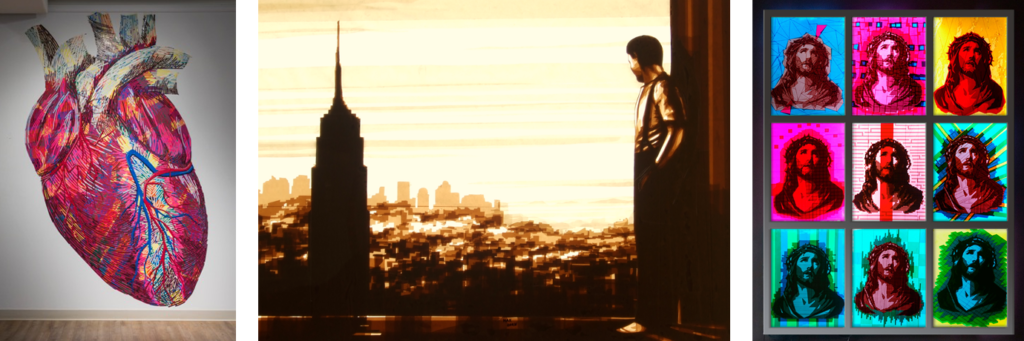 Was simpel klingen mag, stellt die Künstler vor ganz eigene Herausforderungen. So sind sie beschränkt, was das Material in Farben und Maßen betrifft. Einzig mit Sicherheitsmessern oder Skalpellen bearbeiten sie das Band. Umso faszinierender ist die Vielfalt an Kunstwerken, die dabei entsteht: ob auf Holz, Glas oder Metall, auf einer Leinwand, einer Fassade oder einem Möbelstück. Die Werke spielen mit geometrischen Formen, Räumen und Medien.