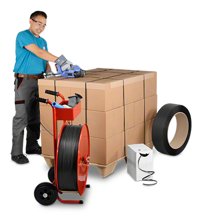 Unser umfassendes Sortiment an Geräten, Bändern und Verschlüssen sowie Zubehör wie Abroller, Scheren oder Kantenschutz entdecken Sie in unserem Web-Shop.