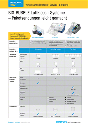 Sie haben alle Fragen beantwortet? Bei MEDEWO haben Sie die Wahl zwischen drei Geräten: dem MINI PAK’R Luftkissen-System, AirBoay nano3 Luftkissen-System und dem AirWave1/AirWave 2 Luftkissen-System. Was zeichnet diese Geräte aus?