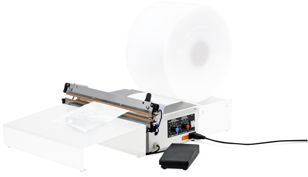 Mit Tisch-Schweissgeräten sind Sie flexibel, was das Verpackungsmaterial betrifft: Sie können damit sowohl die Öffnung von Beuteln als auch Rollenware wie Schlauchfolien oben und unten verschliessen. Je nach Modell bieten sie praktisches Zubehör wie einen Ablagetisch, eine Abschneideeinrichtung oder einen Abroller. Als Halbautomat verfügen sie zudem über ein Fusspedal, wodurch Ihnen beide Hände frei bleiben und Sie noch schneller arbeiten können.
