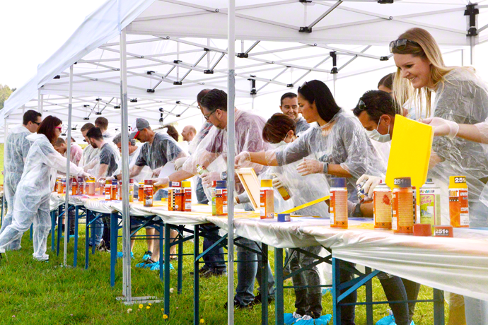 Besonders passend gewählt war daher der Ort der Feier am Bodensee, wo die drei «MEDEWO-Länder» aufeinandertreffen. Der erste Programmpunkt des Jubiläumsfests war ein sogenanntes Action-Painting. Jeder der Verpackungsprofis erhielt dafür eine Leinwand, die er farbig besprühen und mit der Hilfe von Schablonen gestalten konnte. Noch ahnten die Spray-Künstler nicht, was die einzelnen Bilder, die sie malten, als grosses Ganzes später ergeben würden.