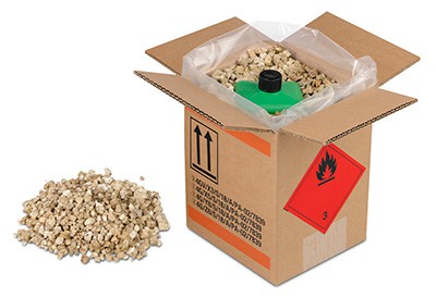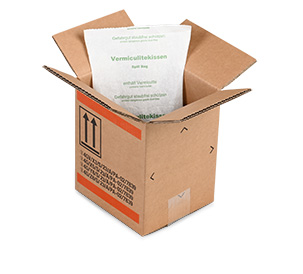 Outre le «4G» pour les caisses en carton ou le «4D» pour les caisses en contreplaqué, vous trouverez parfois la mention «V» sur les codes ONU imprimés. Il s’agit de la même caisse, mais elle a été contrôlée et testée au préalable et est donc autorisée – comme décrit dans le certificat d’homologation – en tant qu’emballage spécial jusqu’à un certain poids maximal pour les marchandises dangereuses. Si les emballages de marchandises dangereuses sont utilisés dans la version 4GV ou 4DV, il est impératif d’utiliser un sac plastique de l’épaisseur minimale prescrite et de la VERMICULITE comme matériau absorbant, soit comme matériau de remplissage loss, soit rempli dans des coussins. Les sacs ont l’avantage de protéger les matières dangereuses sans poussière, car il n’y a pas de contact direct avec le matériau de remplissage VERMICULITE. De plus, les coussins peuvent être facilement retirés du carton, stockés et réutilisés plusieurs fois.