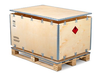 En revanche, les caisses en bois prêtes à être transportées et très stables, composées d’un couvercle, d’un cadre et d’un fond et déjà équipées de patins ou d’une palette, permettent d’emballer en un tour de main même les marchandises dangereuses de poids moyen à lourd. Elles conviennent mieux que les caisses en carton pour l’exportation / le transport outre-mer de marchandises dangereuses en raison de l’humidité de l’air qui apparaît pendant le transport (par bateau ou vers des régions tropicales). Les caisses en bois offrent également des avantages, la manipulation des emballages étant simplifiée, car il n’est pas nécessaire de les cercler ou d’utiliser du ruban adhésif. De plus, elles protègent très bien contre les dommages manuels les matières dangereuses emballées. Les caisses en bois sont en outre facilement empilables et conçues pour être manipulées par des chariots élévateurs.