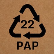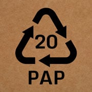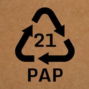 L’abréviation du matériau PAP 21 fait référence au groupe de matériaux recyclables «Autres cartonnages». Il s’agit souvent de composants d’emballage en carton gris/carton compact tels que les patins de palettes, les intercalaires et les angles de protection des bords, etc. Le marquage décrit les matériaux fabriqués à partir de cellulose, de demi-cellulose ou de vieux papiers par collage ou pressage.