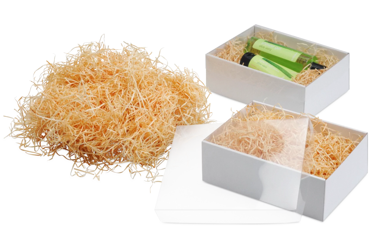 Le papier de soie ou de joaillier, la laine de bois ou le papier plié et découpé en fines lamelles sont très élégants comme matériau de remplissage. Ils protègent la marchandise des chocs et des éraflures, tout en ayant un bel aspect et en apportant une touche supplémentaire de qualité.
