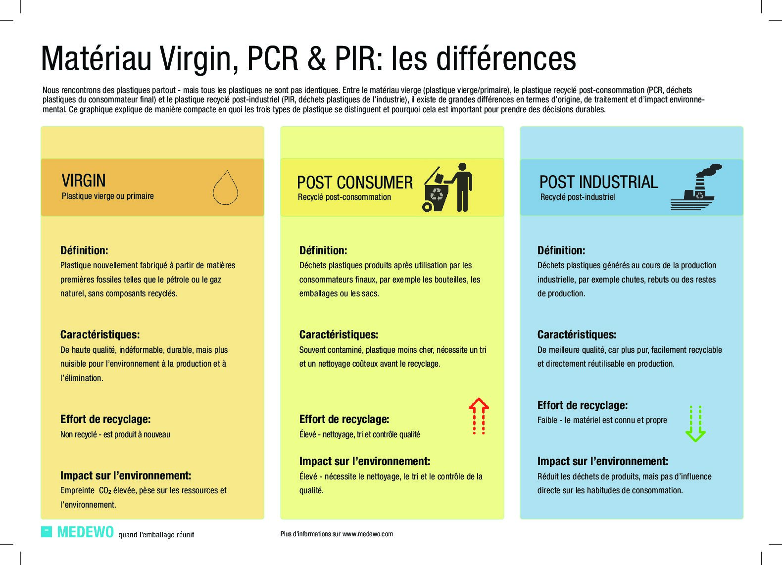 Trois types de plastiques sont distingués en fonction de leur origine, de leur traitement et de leur impact sur l’environnement. Les spécialistes parlent ici de matériaux vierges, PCR et PIR.