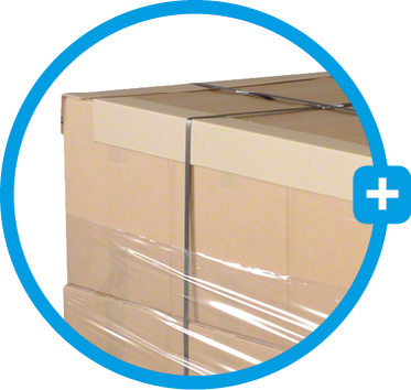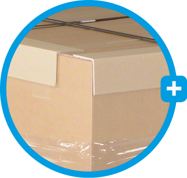 L’emballage extérieur sert à rendre vos articles transportables et les protège de tous les côtés. La méthode classique consiste à utiliser un cartonnage à l’intérieur duquel des aides à l’emballage tels que des matériaux de calage et de capitonnage assurent une protection supplémentaire de vos marchandises. Si vous souhaitez en outre protéger les marchandises empilées contre les dommages ou les éclaboussures d’eau, vous pouvez utiliser un couvercle et/ou un fond de palette.