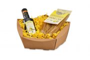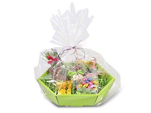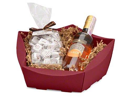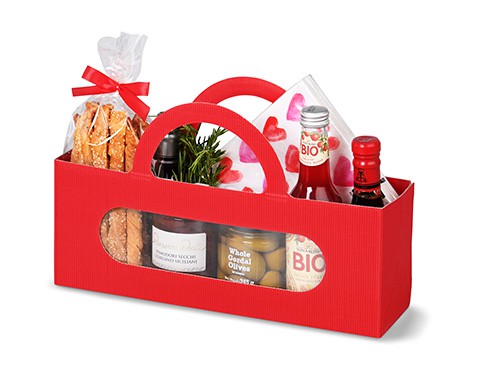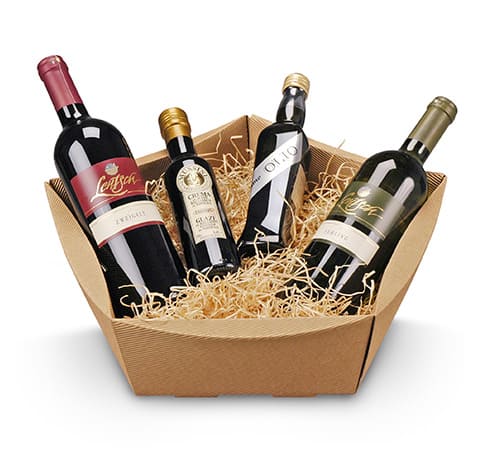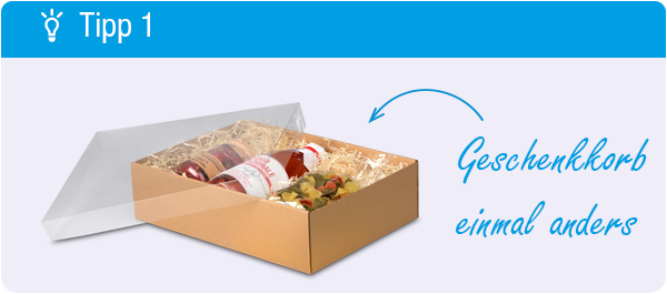 Unser erster Tipp setzt beim Grundlegendsten an: Die Bezeichnung «Geschenkkorb» kann frei interpretiert werden! Statt des klassischen Korbes eignen sich auch Geschenktaschen, -boxen oder -schachteln, um verschiedene Produkte darin stimmungsvoll zu arrangieren. Mit einen transparenten Sichtfenster wird der Blick auf den Inhalt freigegeben, was sich bestens für Feinkost- oder Flaschen-Geschenke eignet. Der integrierte Tragegriff garantiert zudem einen bequemen und sicheren Transport.