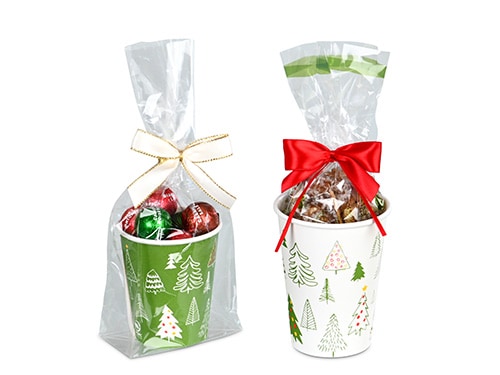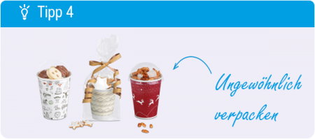 Beim Verpacken können Sie auch «um die Ecke denken». In Heißgetränke-Becher lassen sich nicht nur Getränke füllen, sondern beispielsweise auch umverpackte Plätzchen, Pralinen oder andere Leckereien. Besonders vielfältig in ihrem Einsatz sind Clear Cups. Aus klarem rPET gefertigt ist der Inhalt wunderbar zu erkennen und schont gleichzeitig Ressourcen. Sie sind in vielen Größen und mit unterschiedlichen Deckeln verfügbar.
