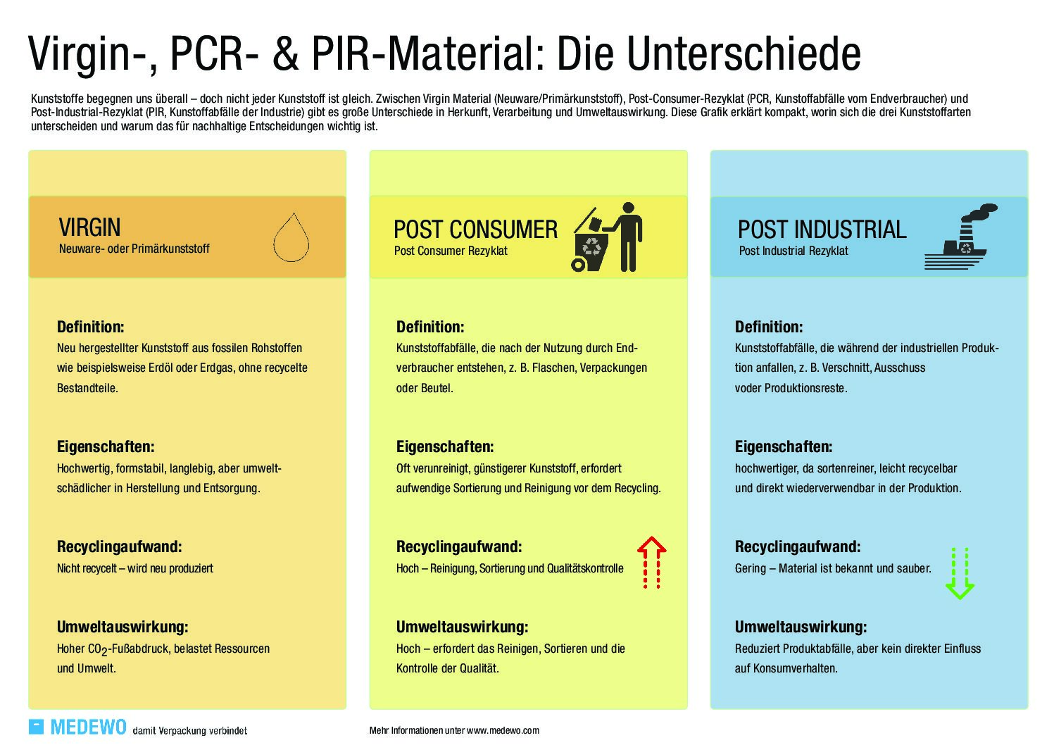 Es werden drei Kunststoffe hinsichtlich der Herkunft, Verarbeitung und Umweltauswirkung unterschieden. Hier spricht man in Fachkreisen von Virgin-, PCR– und PIR-Material.