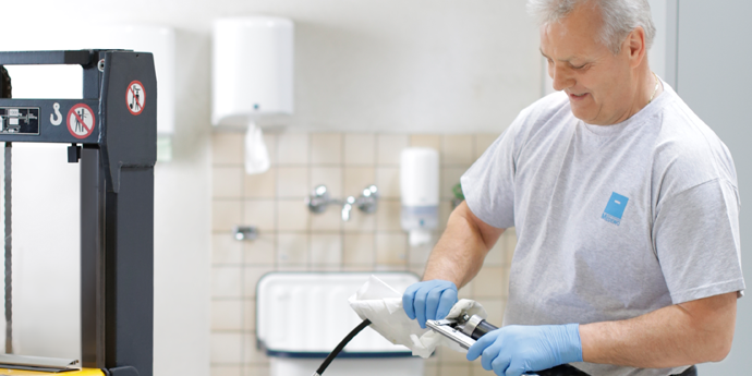 Bevor es an das Putzen von Oberflächen, Fenstern oder Böden im Lager oder Büro geht, sollten Sie sich entsprechend kleiden. Vor allem bei empfindlicher oder trockener Haut sind Handschuhe empfehlenswert, die Sie vor Nässe und den Putzmitteln schützen. Hier gibt es eine große Auswahl. Achten Sie dabei auf das Material: Vinyl-, Nitril- und Baumwollhandschuhe sind gut für Menschen mit einer Latex-Allergie geeignet.
