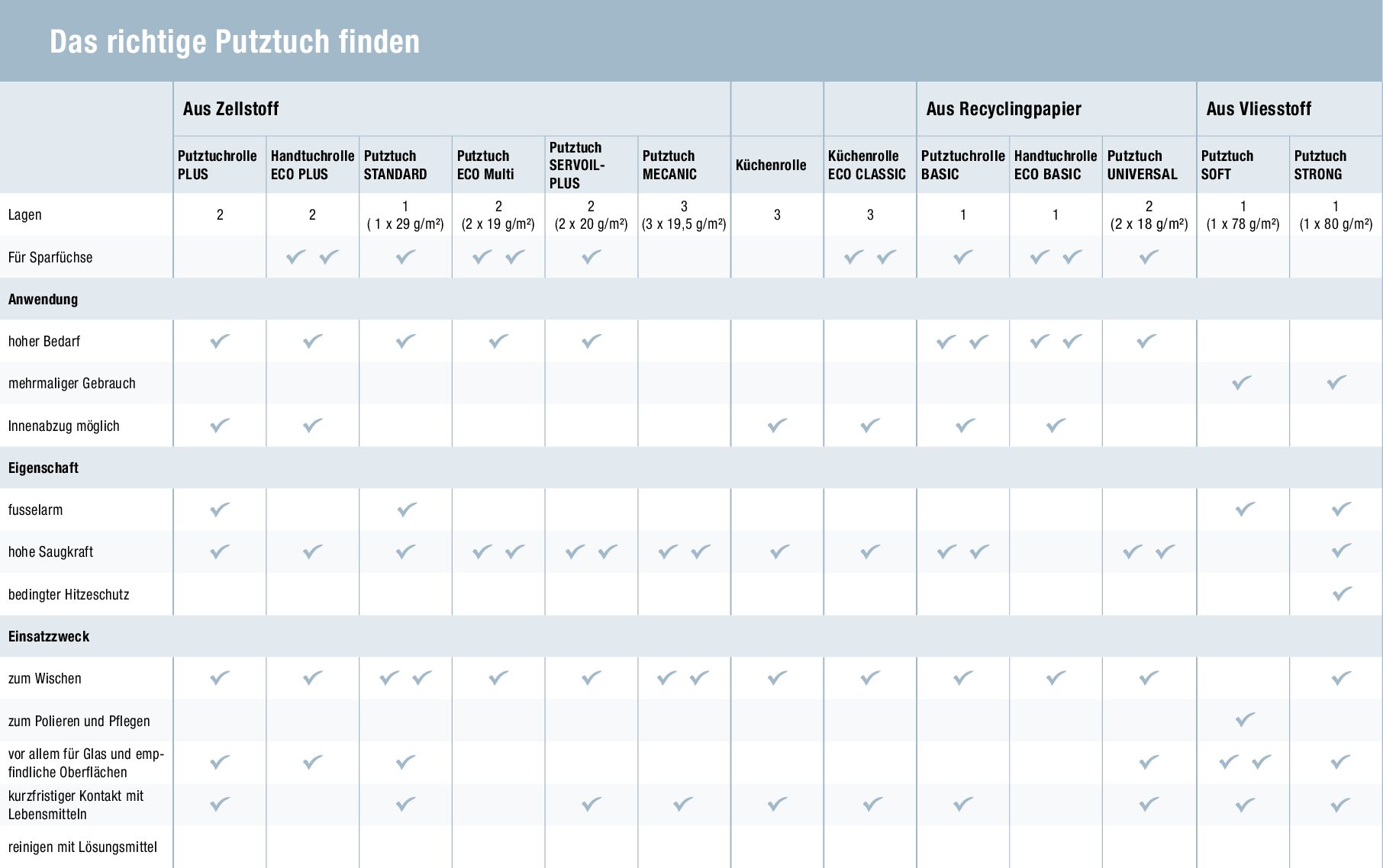 Damit das ganze Unternehmen wieder glänzt, machen Sie sich mit Putzmitteln und entsprechenden Tüchern an die Arbeit. Bei der Wahl des passenden Tuchs kommt es auf den Einsatzzweck an. Muss das Tuch viel Flüssigkeit aufnehmen, reinigen Sie die Flächen am besten mit einem mehrlagigen und saugstarken Papier mit Prägung. Für das Polieren und Pflegen von empfindlichen Oberflächen, etwa bei Maschinen, bieten sich Tücher aus Vlies an. Dieses Material eignet sich auch zur Reinigung mit Lösungsmitteln. Putzen Sie Glas, nehmen Sie am besten fusselarme Tücher.