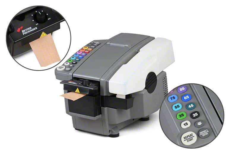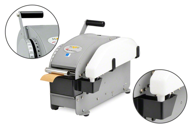 - ein Hebelzug misst, befeuchtet und schneidet das Nassklebeband