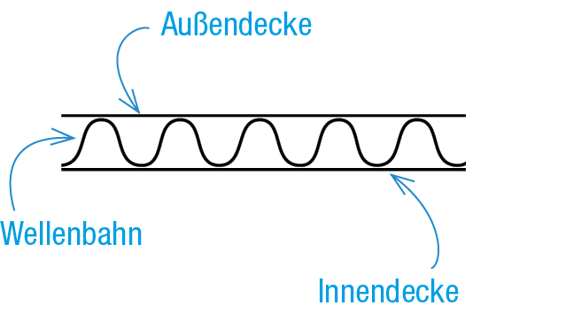 Die Wellpappe kann dabei aus mehreren Lagen bestehen, also ein-, zwei- oder dreiwellig sein. Als «Sonderform» ist sie zudem auch nur mit einer Deckenbahn auf einer Seite erhältlich, als einseitig beklebte Welle oder sogenannte «offene Welle». In diesem Zustand ist sie noch rollbar, weshalb sie oft zum Einwickeln benutzt wird.