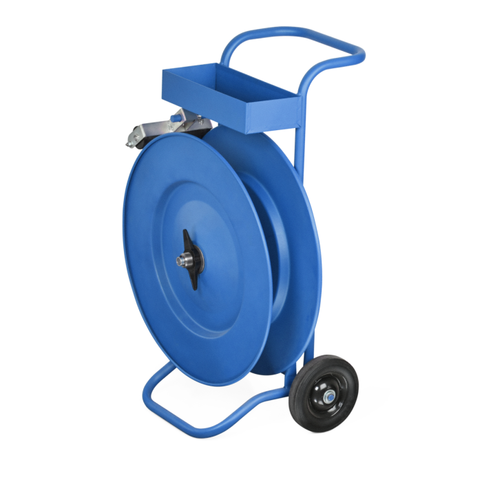 Dérouleur de haute qualité, stable et mobile pour les feuillards de cerclage en PP et PET avec frein de déroulement de bande intégré. Le chariot roulant convainc par sa construction robuste et son design ergonomique. La large barre de poignée et les robustes pneus en caoutchouc permettent une manœuvre sûre et facile, même avec des rouleaux de bande de cerclage lourds. Les accessoires peuvent être rangés dans le compartiment de rangement.