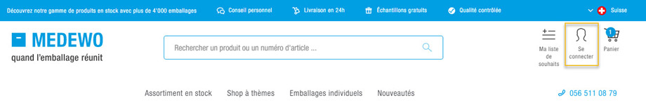 Si vous souhaitez commander des articles supplémentaires, n'hésitez pas à utiliser notre compte utilisateur. Vous y verrez vos commandes passées chez nous et leur statut. Les articles livrés peuvent ainsi être facilement commandés à nouveau. Les options de connexion et d'enregistrement se trouvent en haut à droite de chaque page: