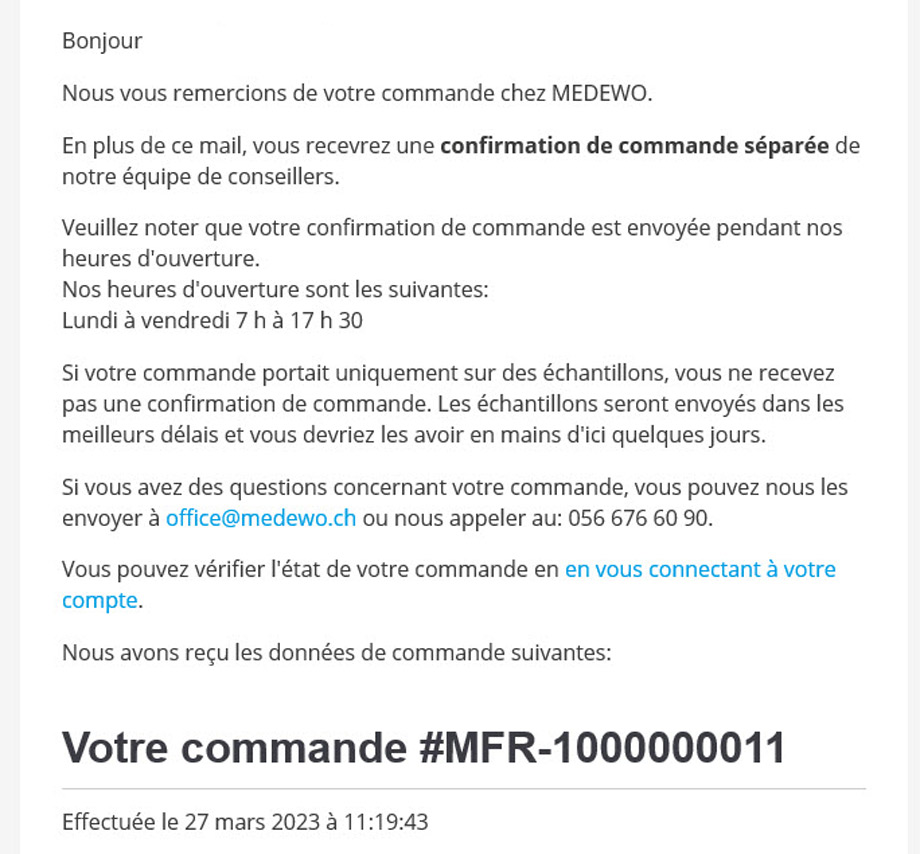 Une fois la commande arrivée chez nous, vous recevez immédiatement une confirmation de réception par e-mail: