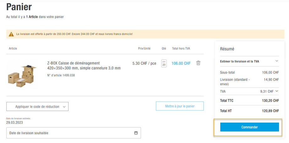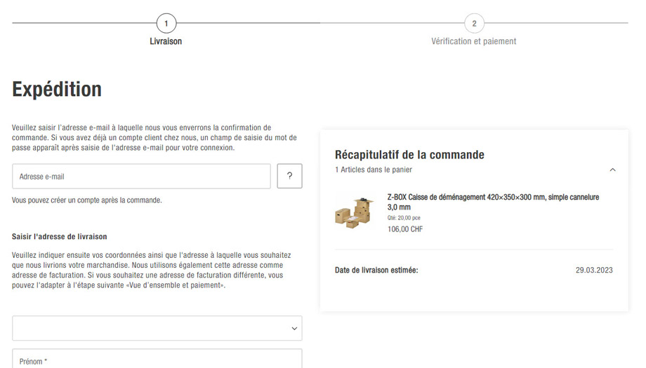Si vous souhaitez commander la marchandise sélectionnée, cliquez sur le bouton « Aller à la caisse». Là, dans le panier, vous pouvez également adapter votre commande, saisir un code de bon d'achat ou indiquer une date de livraison ultérieure. Tous les articles souhaités sont déjà dans le panier? Cliquez ensuite sur le bouton «Aller à la caisse».