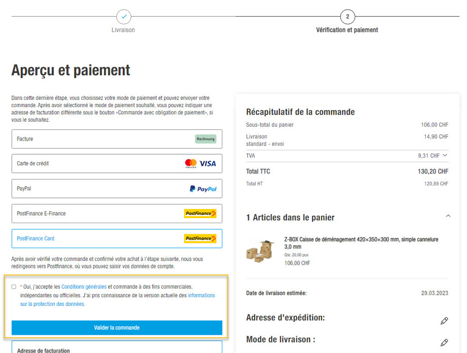 À l'étape suivante, vous pouvez choisir le mode de paiement que vous souhaitez utiliser, et consulter le récapitulatif de votre commande dans le volet de droite. Là, vous pouvez revoir votre commande, vérifier votre adresse de facturation et de livraison et les modifier. Après avoir accepté nos conditions générales de vente, cliquez sur le bouton «Commande payante» pour passer la commande ferme des articles dans le panier. Vous nous proposez ainsi la conclusion d’un contrat d’achat. En fonction du type de paiement, vous serez éventuellement redirigé vers la page du prestataire de paiement.