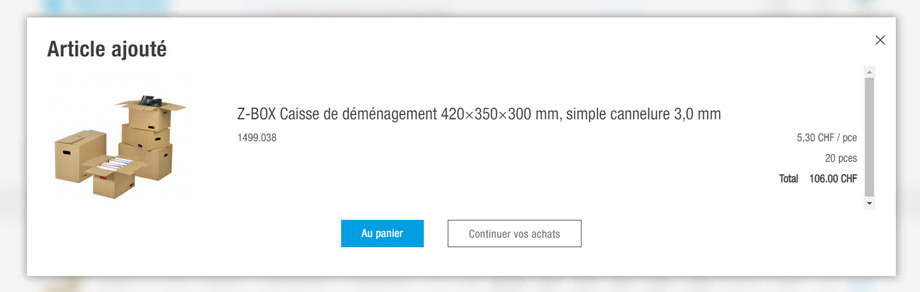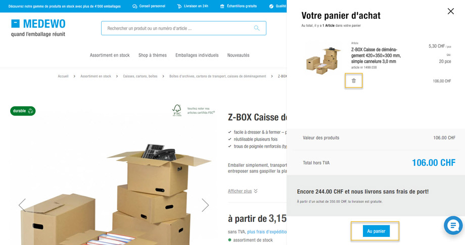 Vous avez par ailleurs la possibilité de consulter tous les articles que vous avez déjà placés dans le panier en cliquant sur le bouton « Panier » en haut à droite. Là, vous pouvez supprimer des articles individuels ou cliquer sur le bouton «Aller au panier» pour ouvrir le panier.