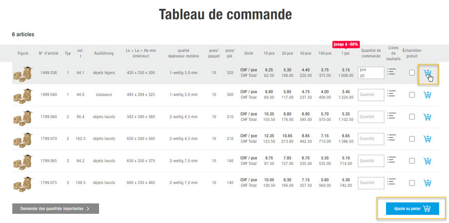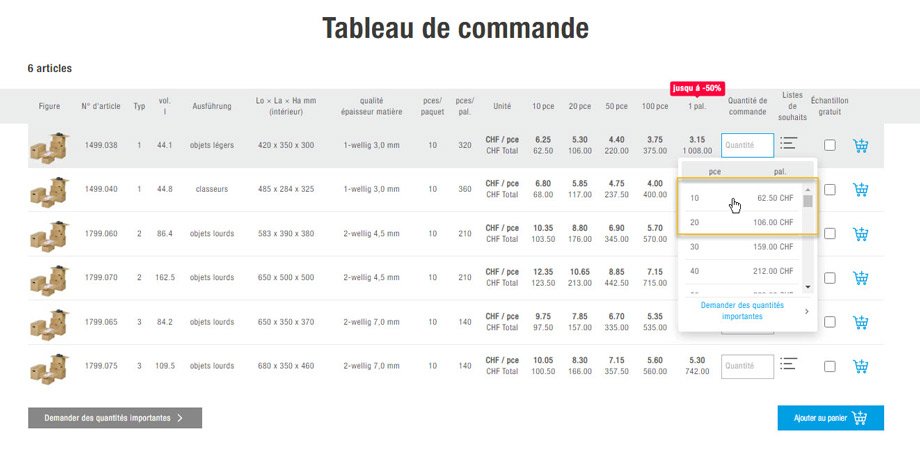Sur la page des produits, sélectionnez un ou plusieurs articles assortis dans notre gamme et l'unité (par ex. pce ou pal.) et indiquez la quantité souhaitée.