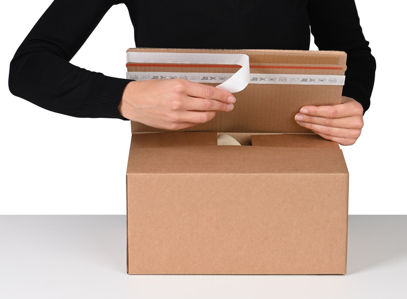 Un avantage décisif est que le produit peut être retourné dans son emballage d’origine. Grâce à un deuxième ruban adhésif sur la fermeture, les clients peuvent facilement refermer le carton et le renvoyer, sans avoir à utiliser de matériaux supplémentaires tels que des cartons d’emballage ou des rubans adhésifs.