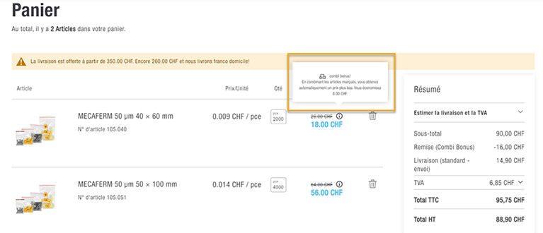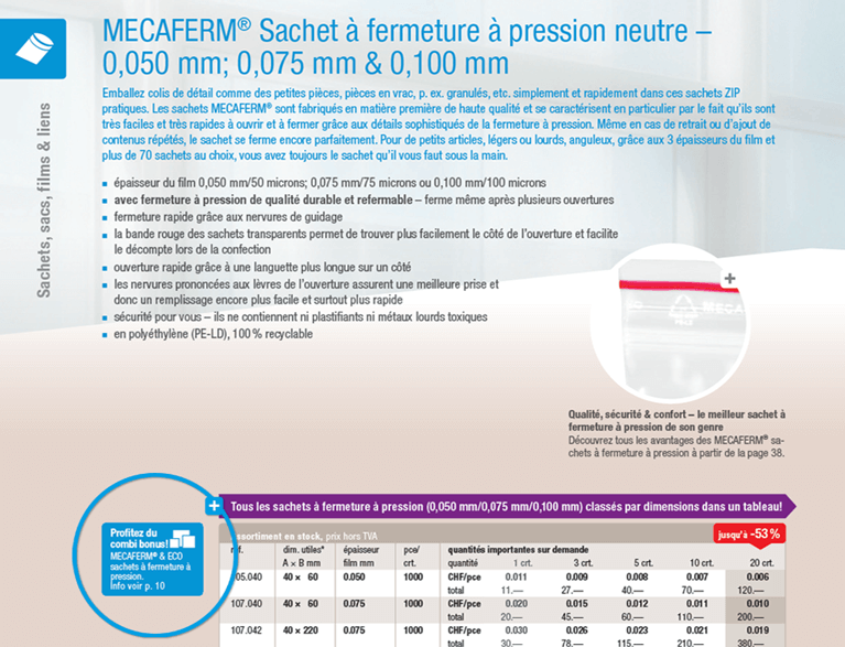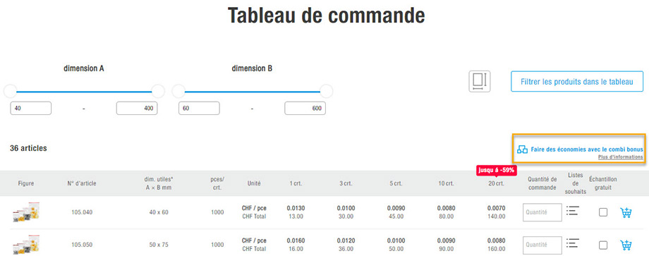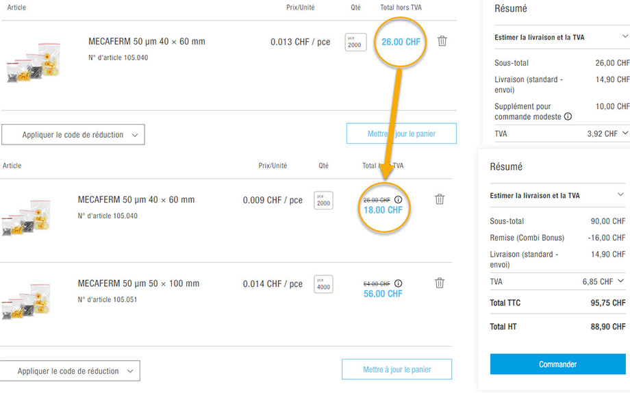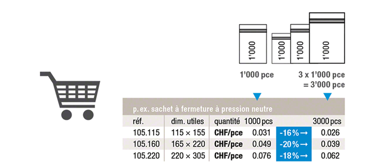 Vous placez 2’000 sachets d'une épaisseur de film 0,05 mm dans le panier. De plus, vous pouvez sélectionner 3’000 sachets d'une épaisseur de film différente. Au lieu des prix unitaires pour la quantité de sachets respective, vous obtenez automatiquement, pour les deux articles, le prix pour une quantité de 5’000 pièces. Selon le tableau des prix, il s'agit du prochain barème de prix possible. Si vous placez à nouveau 5’000 sachets d'une autre dimension utile dans le panier, vous bénéficiez d'une réduction encore plus élevée sur les trois articles. Pour les trois articles, le prix unitaire pour une quantité d'achat de 10 000 pièces s'applique maintenant.