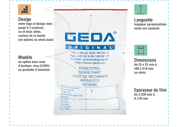 Les sachets à fermeture à pression conviennent parfaitement au stockage sûr et à la confection efficace de vos produits. Pour une protection et une manipulation optimales, les dimensions et l'épaisseur de nos sachets à fermeture à pression peuvent être adaptées individuellement à vos souhaits et à votre produit à emballer.