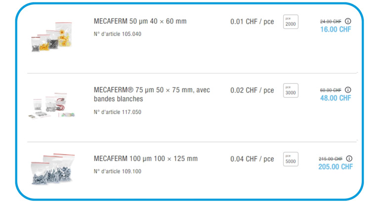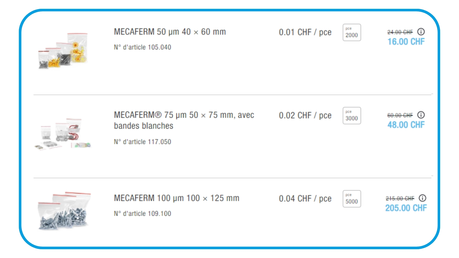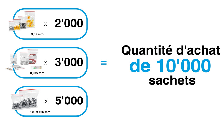 Vous placez 2’000 sachets d'une épaisseur de film 0,05 mm dans le panier. De plus, vous pouvez sélectionner 3’000 sachets d'une épaisseur de film différente. Au lieu des prix unitaires pour la quantité de sachets respective, vous obtenez automatiquement, pour les deux articles, le prix pour une quantité de 5’000 pièces. Selon le tableau des prix, il s'agit du prochain barème de prix possible. Si vous placez à nouveau 5’000 sachets d'une autre dimension utile dans le panier, vous bénéficiez d'une réduction encore plus élevée sur les trois articles. Pour les trois articles, le prix unitaire pour une quantité d'achat de 10 000 pièces s'applique maintenant.
