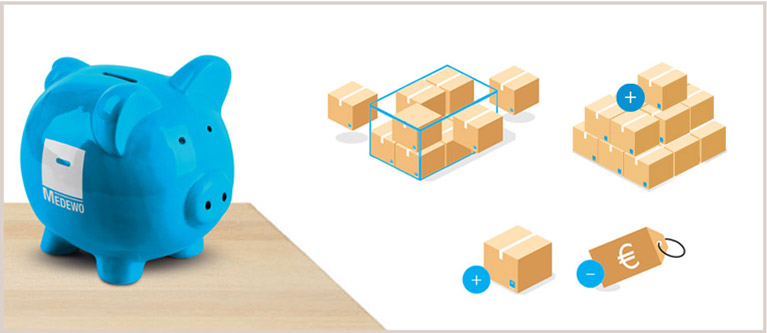 Vous placez 2’000 sachets d'une épaisseur de film 0,05 mm dans le panier. De plus, vous pouvez sélectionner 3’000 sachets d'une épaisseur de film différente. Au lieu des prix unitaires pour la quantité de sachets respective, vous obtenez automatiquement, pour les deux articles, le prix pour une quantité de 5’000 pièces. Selon le tableau des prix, il s'agit du prochain barème de prix possible. Si vous placez à nouveau 5’000 sachets d'une autre dimension utile dans le panier, vous bénéficiez d'une réduction encore plus élevée sur les trois articles. Pour les trois articles, le prix unitaire pour une quantité d'achat de 10 000 pièces s'applique maintenant.
