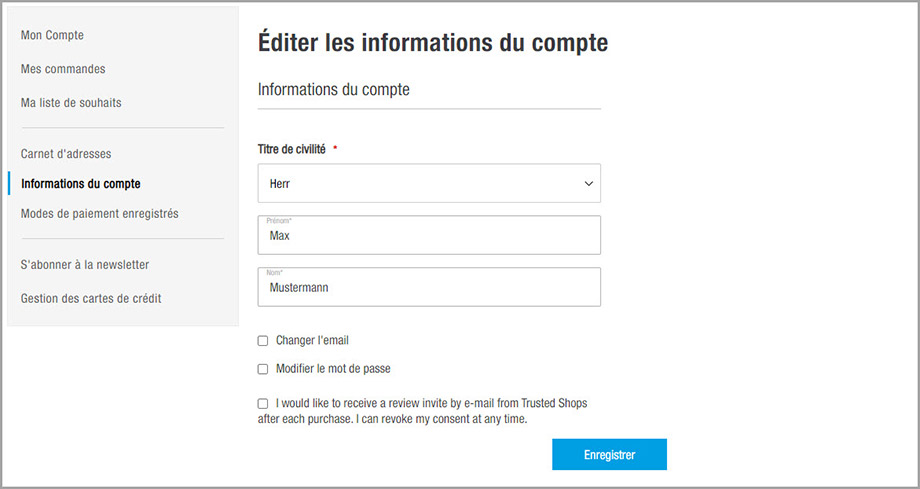 Quand vous avez créé un compte utilisateur, vous pouvez vous y connecter à tout moment en cliquant sur le bouton «Inscription» dans l'en-tête du site Web. Cette interface vous permet aussi de vous déconnecter. Pendant la commande aussi, vous pouvez vous inscrire pour commander encore plus confortablement. Une fois inscrit, vous accédez à la page d'aperçu de votre compte et pouvez par ex. consulter vos commandes, gérer vos données ou placer des articles sur la liste de favoris (voir ci-dessous).