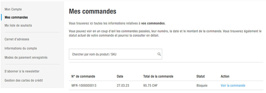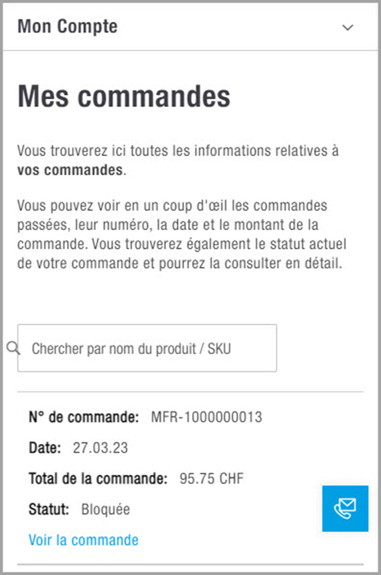 Dans la partie inférieure, vous voyez un aperçu de vos dernières commandes et vous pouvez les consulter en détail en cliquant sur «Voir la commande».