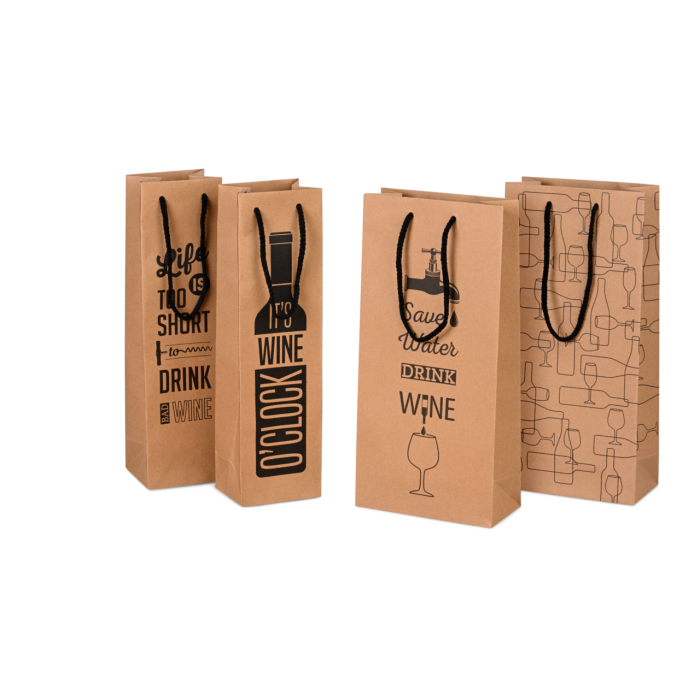 Emballage élégant de bouteilles comme cadeau pour anniversaires, jubilés et autres occasions. Les cabas marron en papier kraft avec un imprimé attrayant et des cordons en tissu noir sont des sacs-cadeaux pour bouteille parfaits. Les sacs sont en papier et conviennent au transport de vin, du vin mousseux et d'autres vins fins.