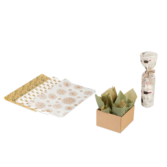 Papier de soie fin et souple avec motifs imprimés. Idéal comme emballage de vente ou de cadeau attrayant ainsi que pour le revêtement décoratif de boîtes de cadeau ou de pochettes.