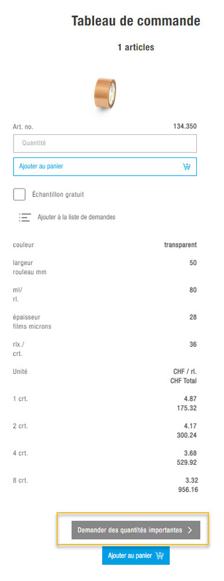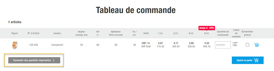 Dans les tableaux de prix de notre webshop, le barème de la quantité d’achat la plus grande – régulière – figure dans un encadré rouge indiquant l’économie réalisée. Si vos besoins pour un article sont supérieurs, vous trouverez un lien vers une demande de grande quantité sous chacun des tableaux. Par un clic, vous accédez à notre formulaire de contact, où vous pourrez saisir facilement la quantité requise ainsi que vos coordonnées. Votre conseiller MEDEWO personnel vous contactera normalement dans le délai d'une journée ouvrée, avec une offre attractive.