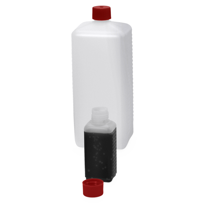 fermeture vissée garantie étancheforme quadrangulaire – peu encombrant tient bien en main grâce aux cannelures latérales modèles solides ouverture du flacon Ø 19 mm étanchéité: cône intérieur dans le couvercle en polyéthylène (HDPE), recyclable