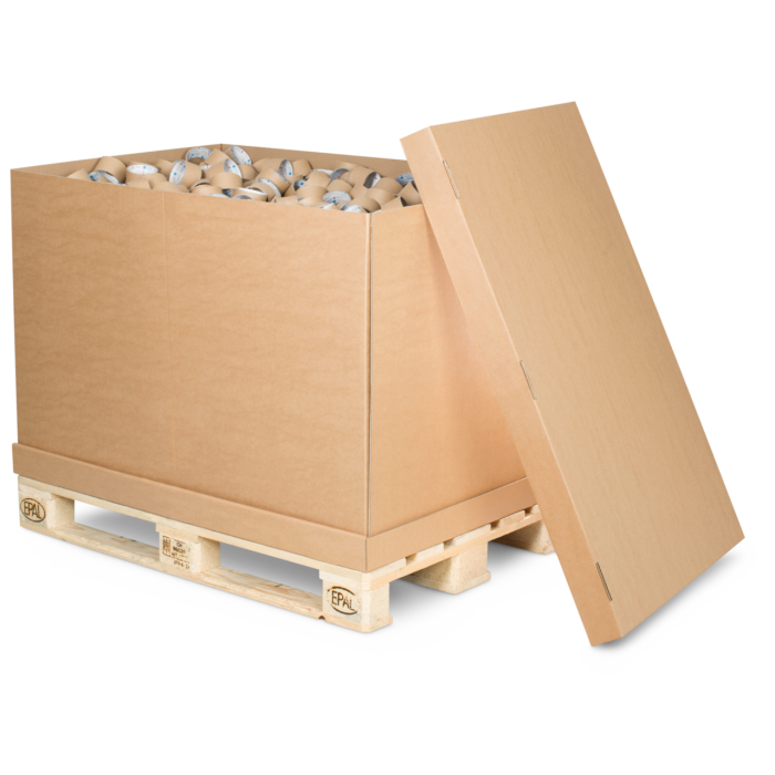 Le conteneur en carton ondulé stable est composé de deux éléments d’enveloppe, d’un fond et d’un couvercle adaptés. Le conteneur palette protège vos produits de manière optimale contre la saleté et les dommages. Il convient ainsi idéalement à l’emballage par ex. de pièces de machines et d’outils, mais également de marchandises légères pour transport collectif ou de marchandises légères en vrac.