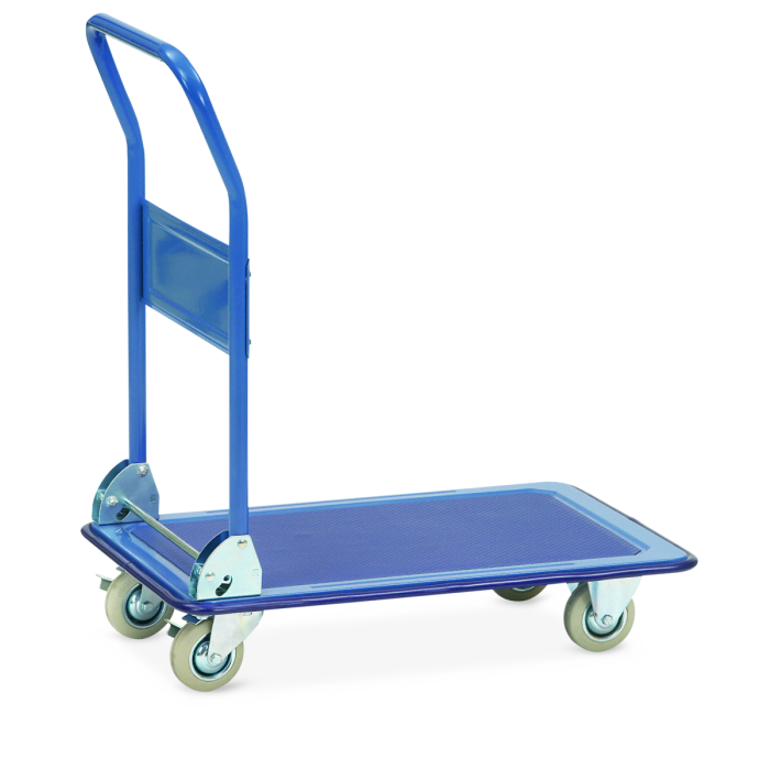 Un chariot de transport pour un usage quotidien. Facile à ranger et peu encombrant grâce à la poignée de poussée repliable.