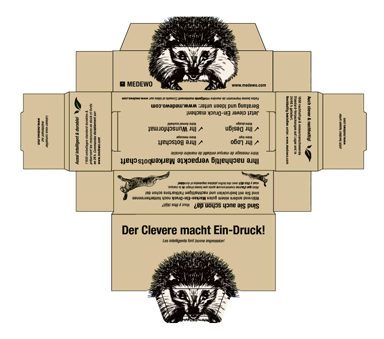 En plus de la forme individuelle, vous pouvez également faire imprimer votre emballage avec votre logo, des informations sur le produit et des images en utilisant l'impression offset jusqu'à 6 couleurs ou l'impression flexo jusqu'à 4 couleurs. De cette manière, vous faites également connaître votre entreprise et renforcez votre marque.