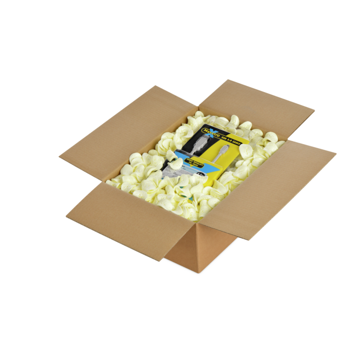 Les flocons d’emballage jaunes bon marché possèdent de très bonnes caractéristiques d’écoulement et sont donc particulièrement faciles à travailler. Les flocons en polystyrène rembourrent vos produits et remplissent aisément les espaces libres, ce qui leur permet de protéger au mieux vos produits lors de la manutention en magasin et lors du transport chez vos clients.
