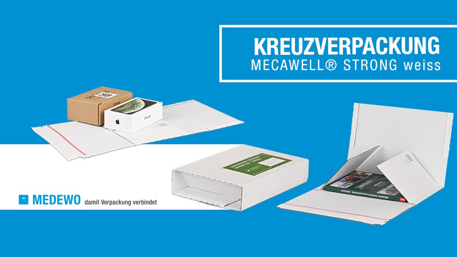 Die Kreuzverpackung MECAWELL® STRONG weiss ist die extrem robuste Versandlösung für Bücher, Kataloge, Software oder Onlinehandelswaren. Sie überzeugt durch variable Füllhöhe dank praktischer Höhenrillungen – eine Verpackung passt für viele Formate. Die stabile Kreuzkonstruktion schützt rundum und lässt sich besonders schnell befüllen, ohne die Verpackung wenden zu müssen.